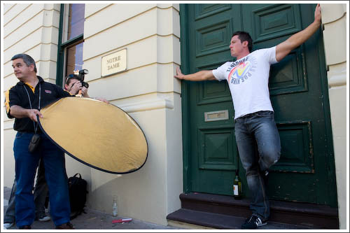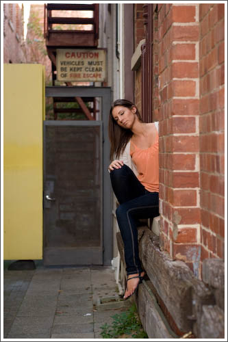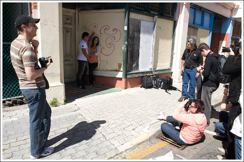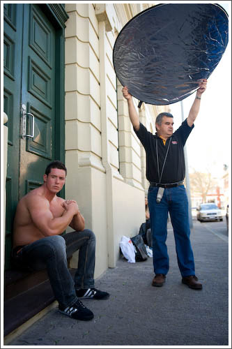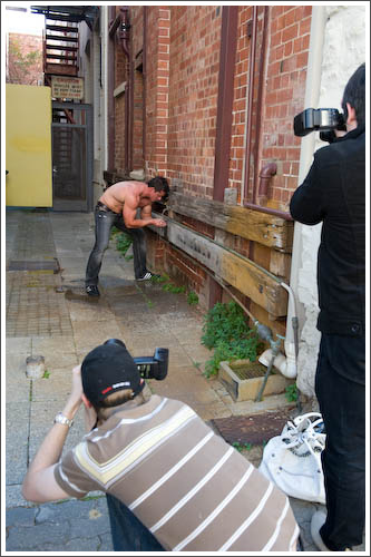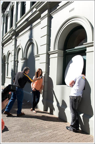 The West End of Fremantle is ripe with settings for creative outdoor portraiture. From grungy, graffiti-covered old doorways and entrances, to colonial buildings with their grand facades. We even found a great alleyway on Mouat Street, with soft, filtered light that made for some amazing portrait of models Sophie and Frank. The girls took this opportunity to get Frank shirtless and for a moment, the workshop became a bit more firemen calendar pin-up than portrait!
