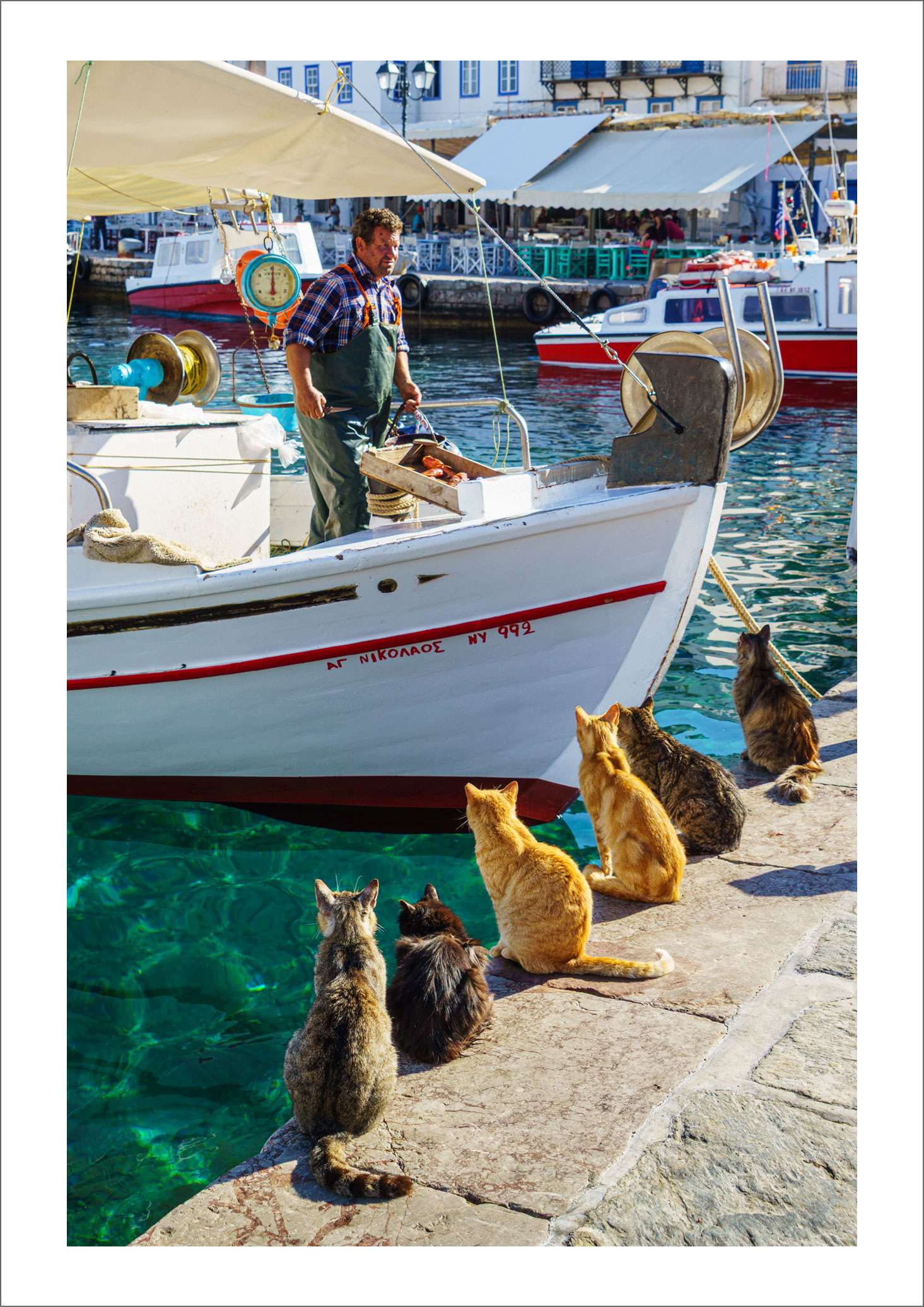 Also available is an A2 print of my very popular “Cats of Hydra Island”, showcasing the cats of this iconic Greek island waiting patiently in line as a fisherman arrives at the harbour with the morning’s catch. The print will be A2 size (42cm x 59.7xm), with the image centred within the print to allow for a white margin around the image.