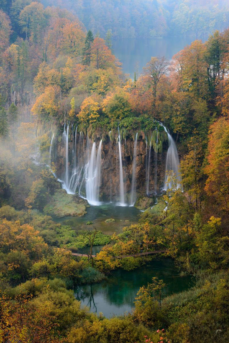 The Plitvice Lakes are a series of tiered lakes, each connected by cascades and dramatic waterfalls. In autumn, the foliage takes on a piebald mixture of golds and reds and greens, all reflected in the emerald and turquoise waters of the lakes.